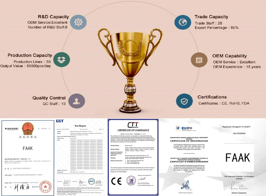 Qianai Technology Group has china top sex toy brand-original factory. mainly focusing on developing. manufacturing and marketing adult products. especially producing dildo. anal plug. male chastity device and silicone vibrator. We are born from 2005 with our own factory in Ganzhou Jiangxi and 4 more OEM factories in Shenzhen and Guangzhou. therein 3 subsidiaries as Shenzhen Qianai Adult Products Co.. Ltd.. Jiangxi Huakou Adult Products Co.. Ltd.. and Jiangxi Qianai Health Technology Co.. Ltd.